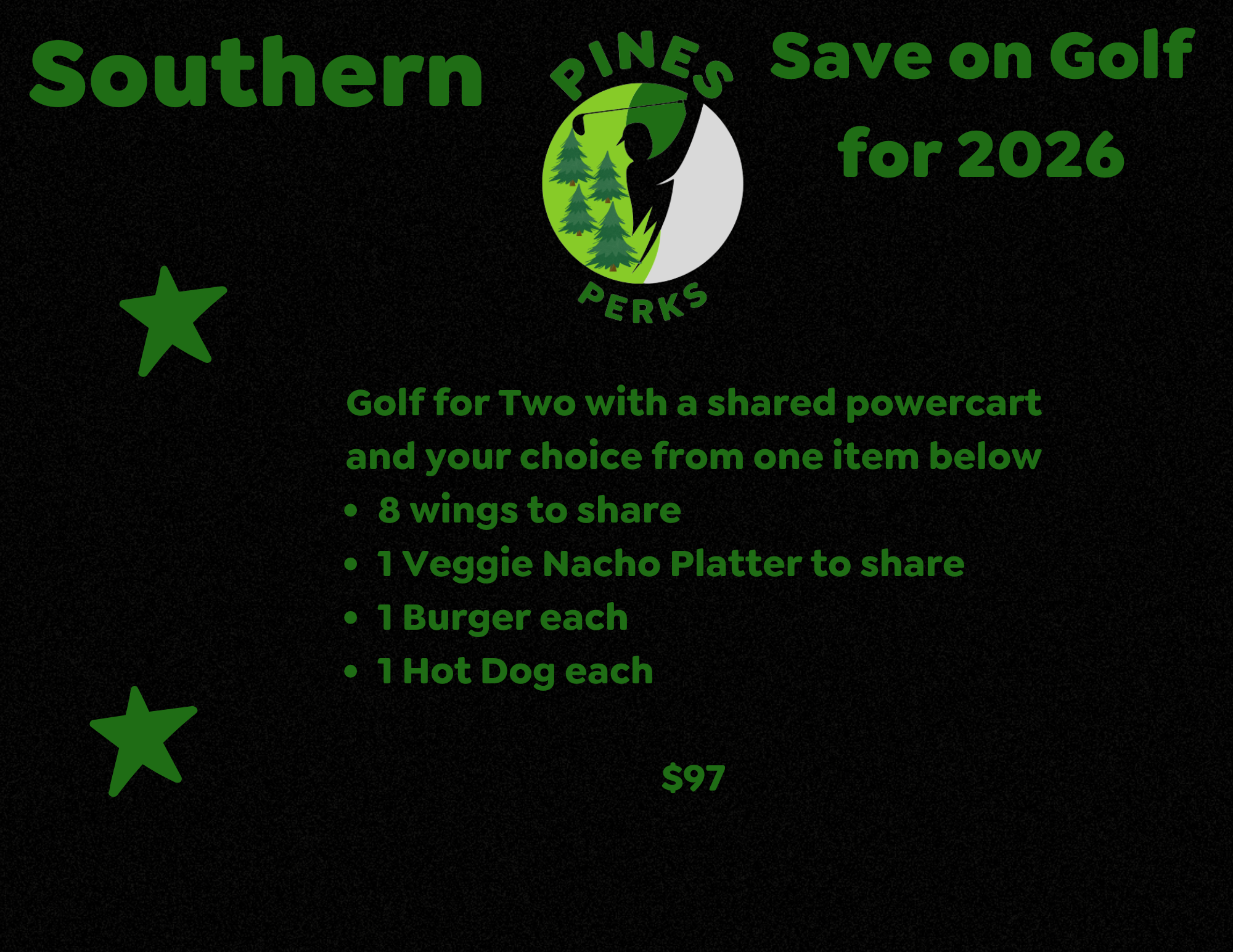 Get ready for a fun day on the greens with the Back to School Pines Perk! Enjoy 18 holes of golf for two, sharing a power cart for the perfect team vibe. After the game, dive into your choice of a shared nacho platter, a burger each, a pound of wings to share, or a hot dog each. It’s the perfect way to celebrate the season with great golf and tasty bites!