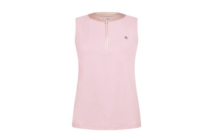 Elevate your golf game with this sleeveless metallic top, designed for unrestricted movement on the course. The metallic mock neck adds a sophisticated touch while the sleeveless cut maximizes your swing range. Crafted from a premium blend of 44% polyester, 44% recycled polyester, and 12% elastane, this top delivers exceptional stretch and lasting durability. The luxurious 681 Charm Pink hue complements the Palm Springs-inspired collection perfectly, bringing style and performance together in one versatile piece.